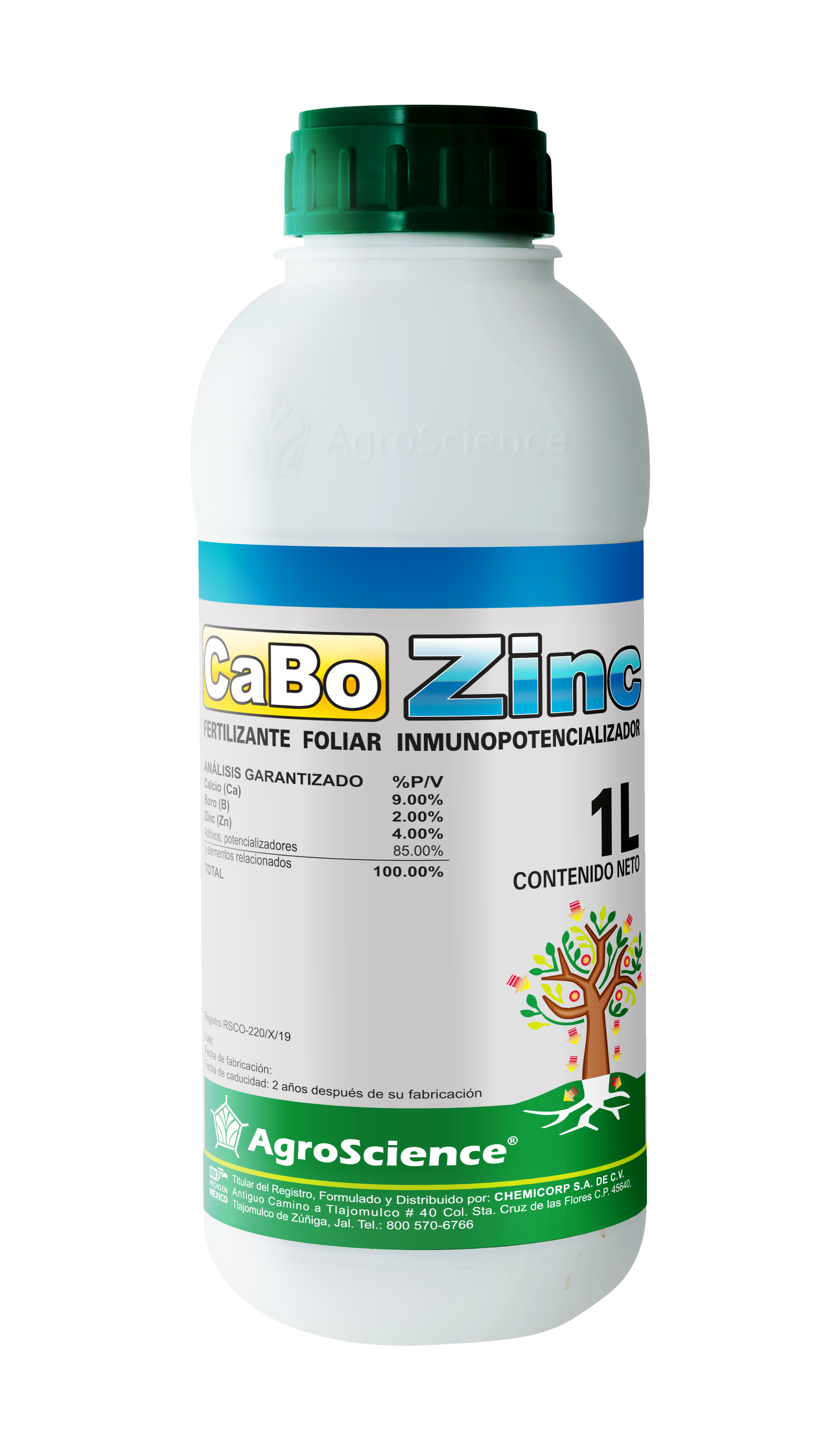 CaBoZinc es un fertilizante foliar líquido, soluble de alta concentración cuya fórmula especialmente balanceada pone a disposición de las plantas el calcio, boro y zinc, esenciales para tener cultivos de alta calidad y un alto rendimiento. CaBoZinc tiene un papel fundamental en la integridad celular, engrosa las paredes celulares, mejora la polinización, ayuda a incrementar la floración, amarre de frutos, y correcta formación de los mismos.