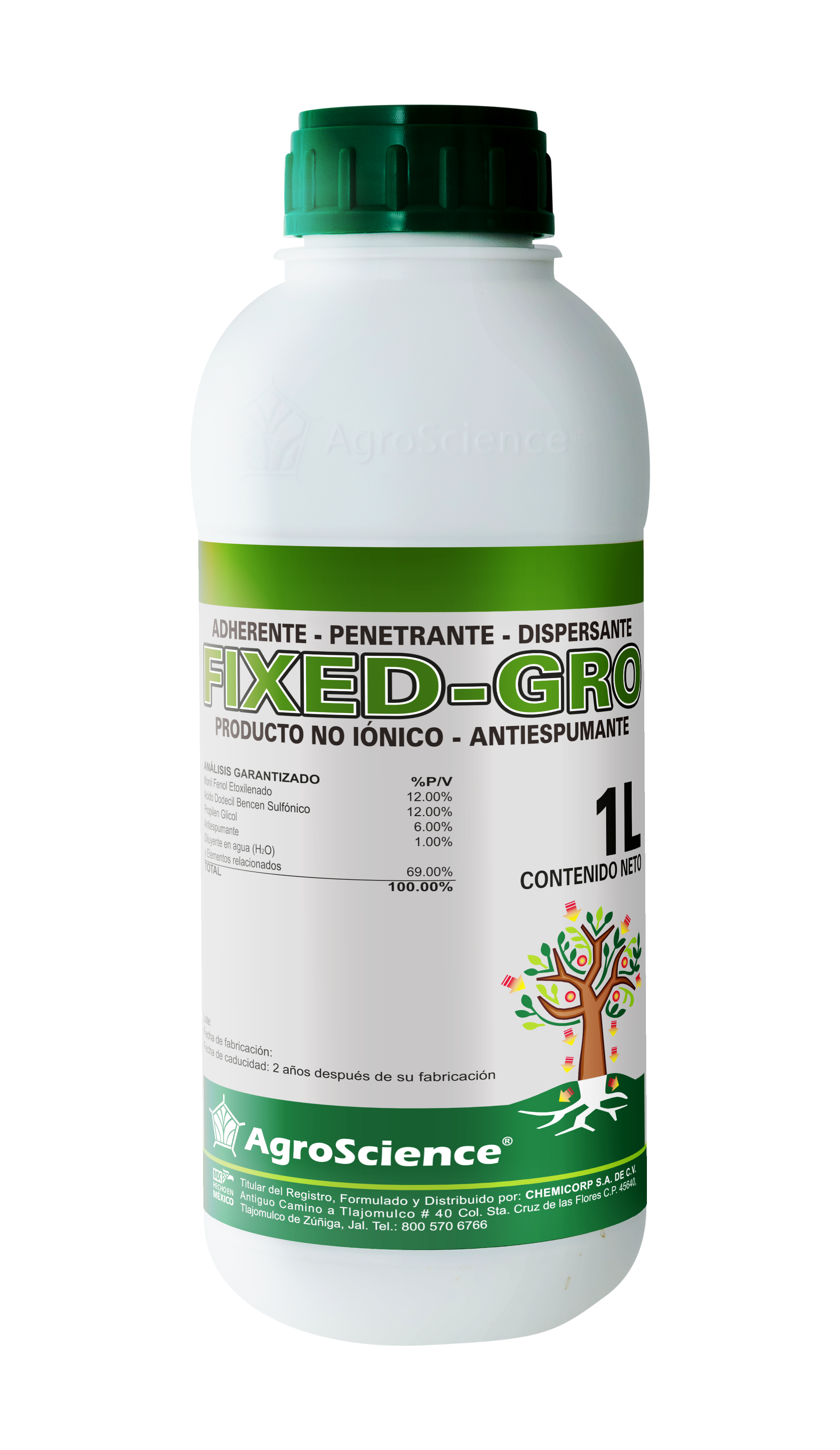 Fixed-Gro es un producto compuesto de adherentes y penetrantes que proporcionan gran disolución y penetración, lo que permite hacer más eficiente la aplicación de agroquímicos en general. Es un producto NO IÓNICO, por lo que no reacciona, ni altera las propiedades de los agroquímicos, favoreciendo su asimilación.