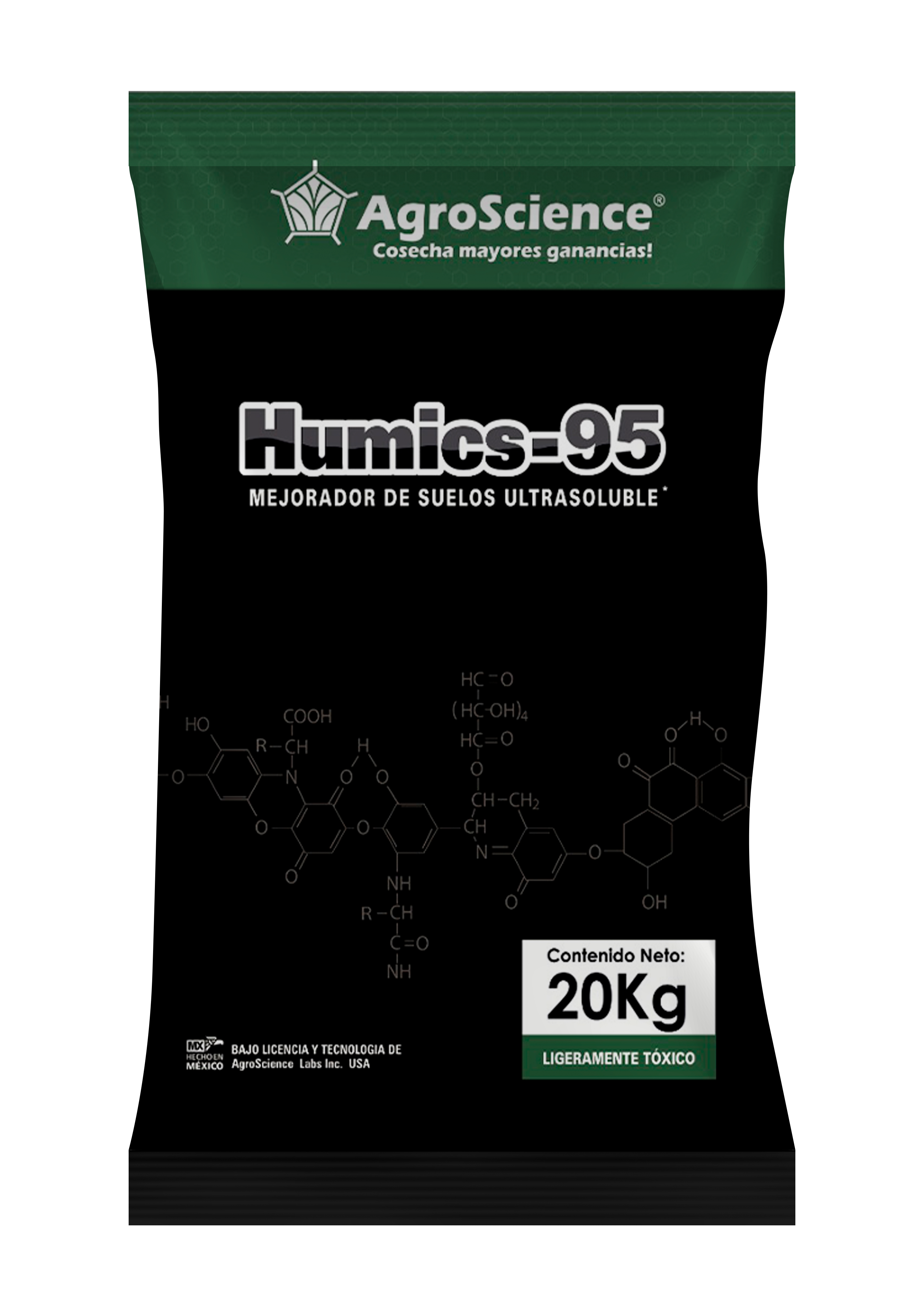 Humics-95 es un complejo de sustancias húmicas y fúlvicas de rápida liberación, derivadas de leonardita (grupo de carboxílicos y polifenoles que mejoran la resistencia a patógenos) y promueven una mejor asimilación de todos los minerales. Mejora la porosidad del suelo incrementando la oxigenación, estimula el crecimiento de las raíces, reduce el estrés por sequía y mejora la estabilidad del rendimiento. Reduce el calor y el estrés salino. Ayuda a reducir la erosión y aumenta las condiciones de aireación, aumenta la capacidad de retención de agua en el suelo, estimula el crecimiento de la parte superior, estimula la producción de clorofila.