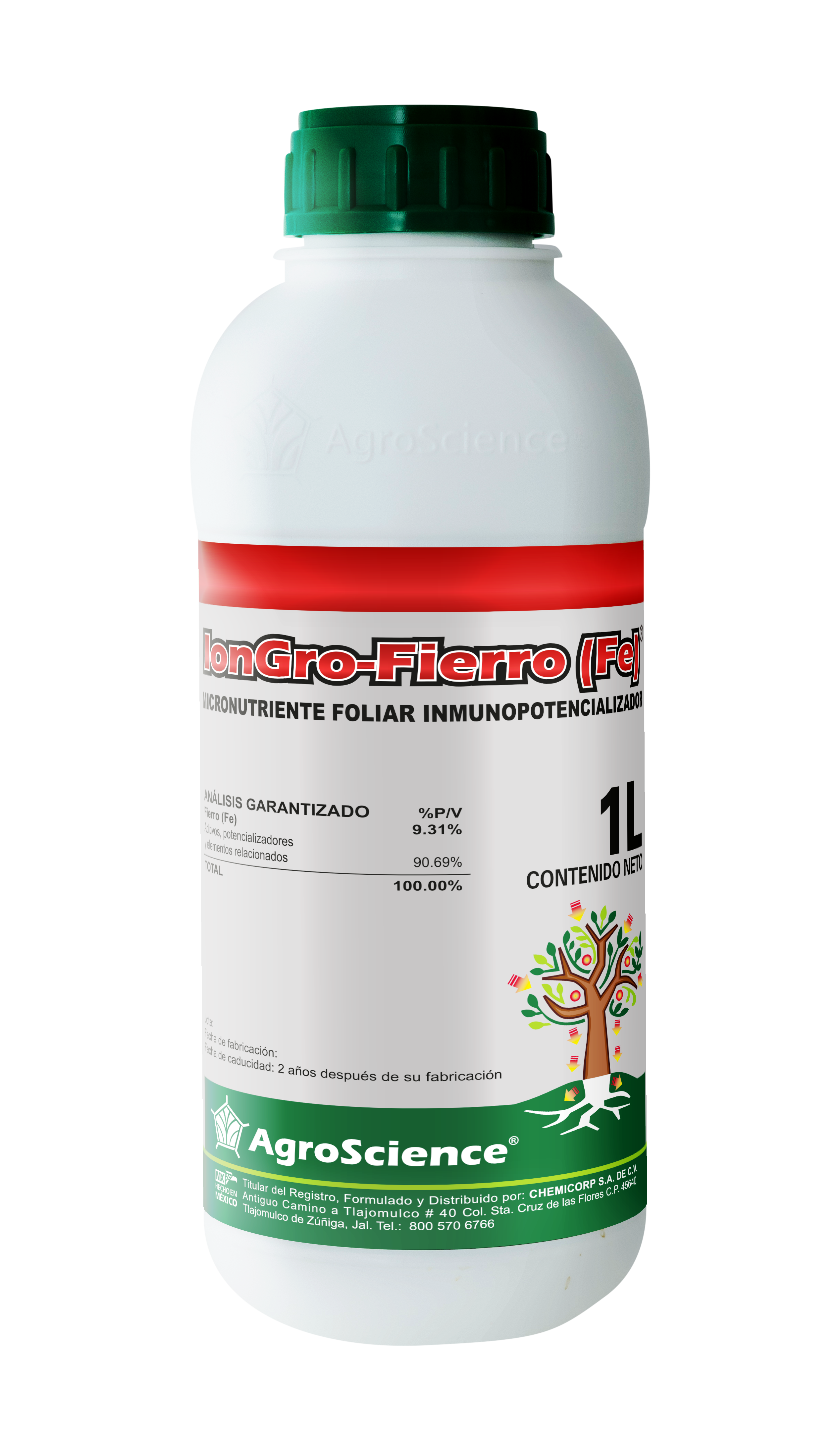 IonGro-Fierro (Fe) es un fertilizante foliar líquido soluble y de alta concentración, que cubre las necesidades de fierro en los diferentes cultivos. Las manifestaciones de deficiencia de fierro en general son: clorosis entre las venas, principalmente en las hojas jóvenes. En deficiencias severas el follaje joven se bloquea completamente para después morir (necrosis).